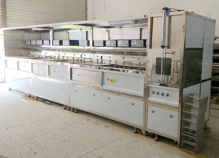 自動上料→1槽清洗劑超聲清洗28K→2槽清洗劑超聲清洗40K→3槽純水超聲漂洗28K→4槽純水超聲漂洗40K→5槽純水超聲漂洗40K→6槽熱風烘干→自動下料。