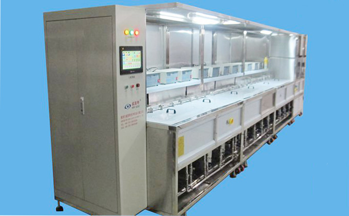 閉環式馬達全自動超聲波清洗機本設備是一個全自動清洗系統,清洗過程由PLC控制,7個由不銹鋼材質制作的超聲波清洗槽及相對應的儲液槽、拋動裝置組成的一條連續工作的裝置。